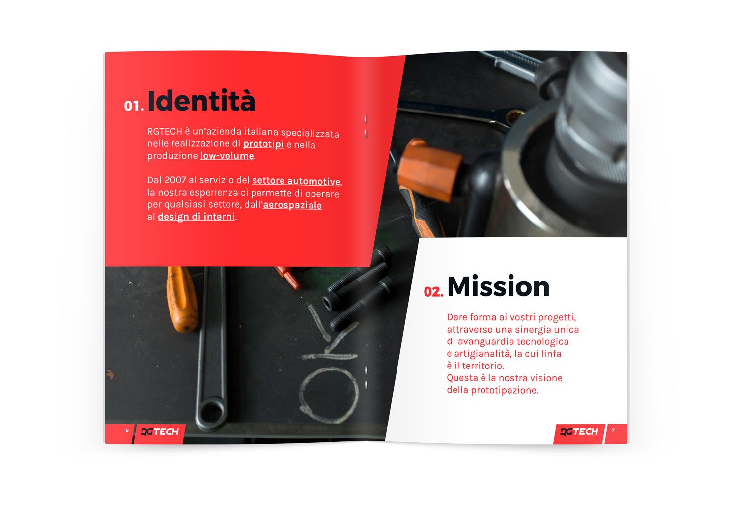 Servizi e soluzioni. La parte produttiva vera e propria, articolata in lavorazioni per la prototipazione è raccontata dando rilievo alle modalità con cui viene svolto il lavoro, valorizzando le persone. Questo viene evidenziato a livello visivo dalle immagini realizzate e raccontato in prima persona da chi lavora in RGTech.